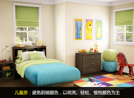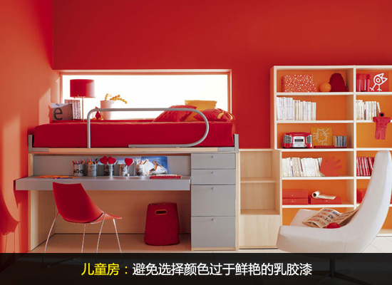 避免选择颜色阴暗怪诞的乳胶漆:儿童房在色彩和空间搭配上最好以明亮、轻松、愉悦为选择方向。不妨多点对比色,用这些来区分不同功能的空间效果最好,过渡色彩一般可选用白色。对于性格软弱内向的孩子,宜采用对比较强烈的颜色,刺激神经的发育。而对于性格太暴躁的,宜淡雅的颜色,则有助于塑造健康的心态。