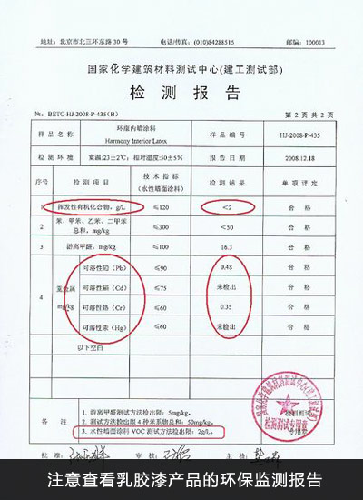 选择正规的大品牌产品或正规渠道进行购买。注意查看乳胶漆产品正面的标注名称、商标、净含量、成分、使用方法和注意事项。选购的时候要求商家出具产品的环保检测报告,仔细阅读,关注其环保指标VOC、游离甲醛、重金属等达标没有。
