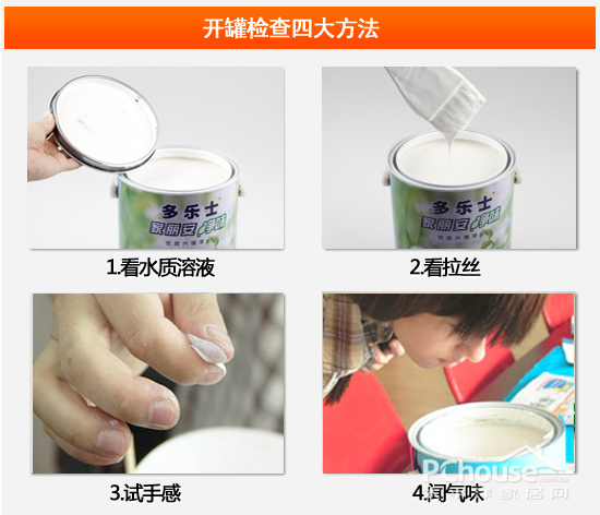 乳胶漆开罐检查质量:一看水质溶液,优质的乳胶漆比较粘稠,呈乳白色的液体,无硬块、搅拌后呈均匀状态,没有异味;二看拉丝,取刷子粘点乳胶漆,能挂丝长而不断均匀下坠的为好;三试手感,用手指摸,正品乳胶漆应该手感光滑、细腻;四闻气味,非环保型的涂料大多有刺激性气味,闻一闻涂料中是否有刺鼻的气味。