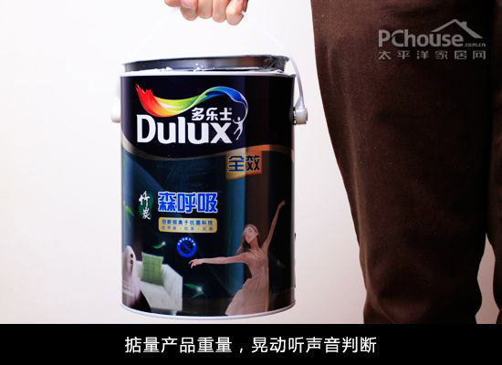 一般来说,质量合格的乳胶漆,一桶5升的大约为7公斤左右,一桶18升的大约为25公斤左右,可以通过掂量漆桶的分量来判断是否合格。此外还有一种简单的方法,即将乳胶漆漆桶提起来,正规品牌乳胶漆晃动一般听不到声音,很容易晃动出声音则证明乳胶漆黏度不足。