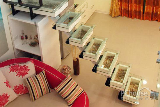 玻璃楼梯:玻璃既时尚又容易清洁,在一些充满设计感的家居,常见这种玻璃楼梯。这种材质能给空间带来通透感,利于采光,配合灯光效果,玻璃楼梯能成为家居的一个装饰品。