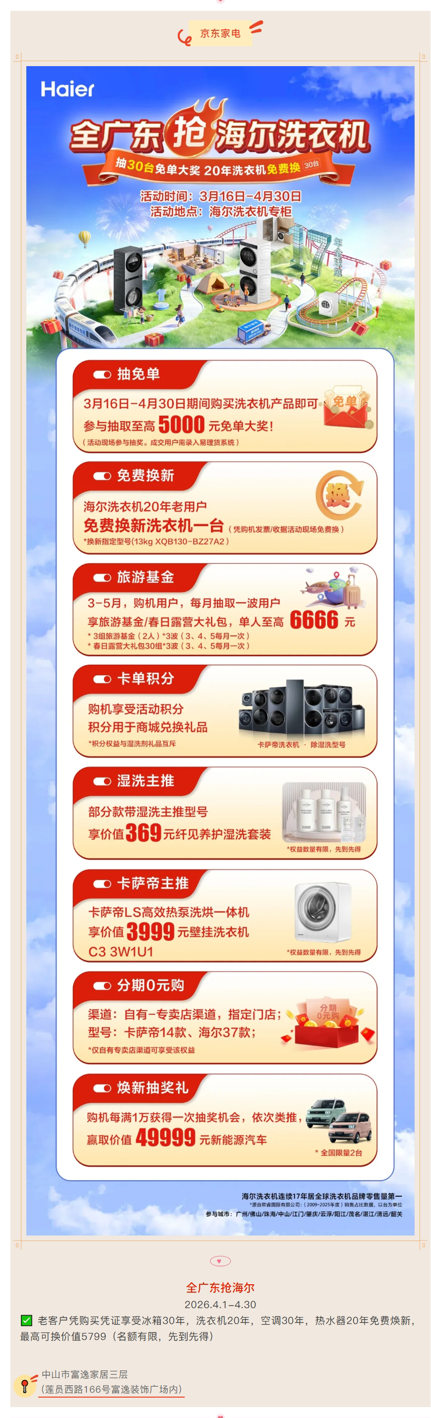 ✅ 老客户凭购买凭证享受冰箱30年,洗衣机20年,空调30年,热水器20年免费焕新,最高可换价值5799(名额有限,先到先得)